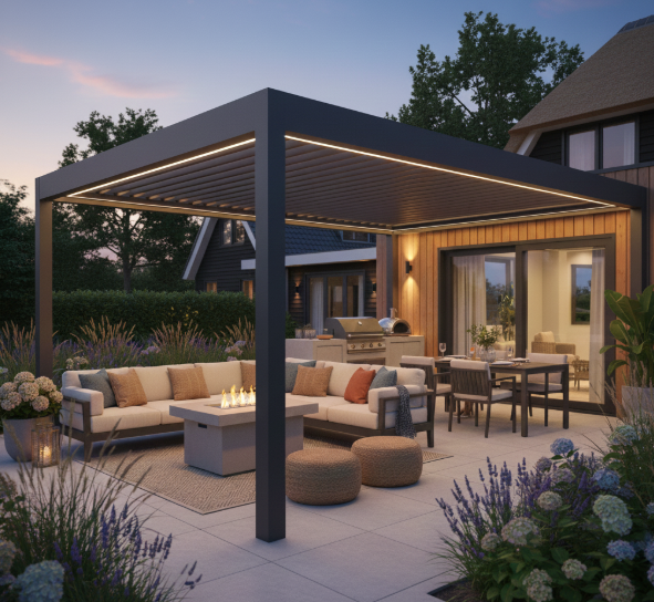 Doordat je beschermd zit tegen wind en regen, zit je vaker onder je lamellen overkapping dan op een open terras. Met verstelbare lamellen bepaal je zelf hoeveel zonlicht er binnenvalt, waardoor het er aangenaam blijft. Regent het? Dan draai je de lamellen met één druk op de knop gewoon helemaal dicht. Zo ontstaat er een tweede woonkamer in je tuin: stijlvol, beschut en het hele jaar door bruikbaar.