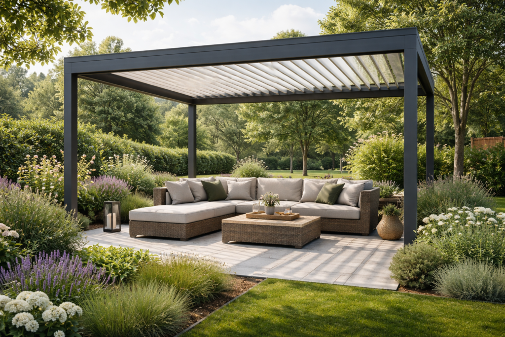 Een terrasoverkapping met verstelbare lamellen vergroot de ruimte in je tuin, doordat je het terras aanpast aan het weer. Door de lamellen te kantelen, regel je de inval van zonlicht en schaduw. Bij regen sluit je ze volledig en blijft het terras droog. Daardoor gebruik je dezelfde plek op meer momenten van de dag en in meerdere seizoenen, zonder dat het comfort verloren gaat.