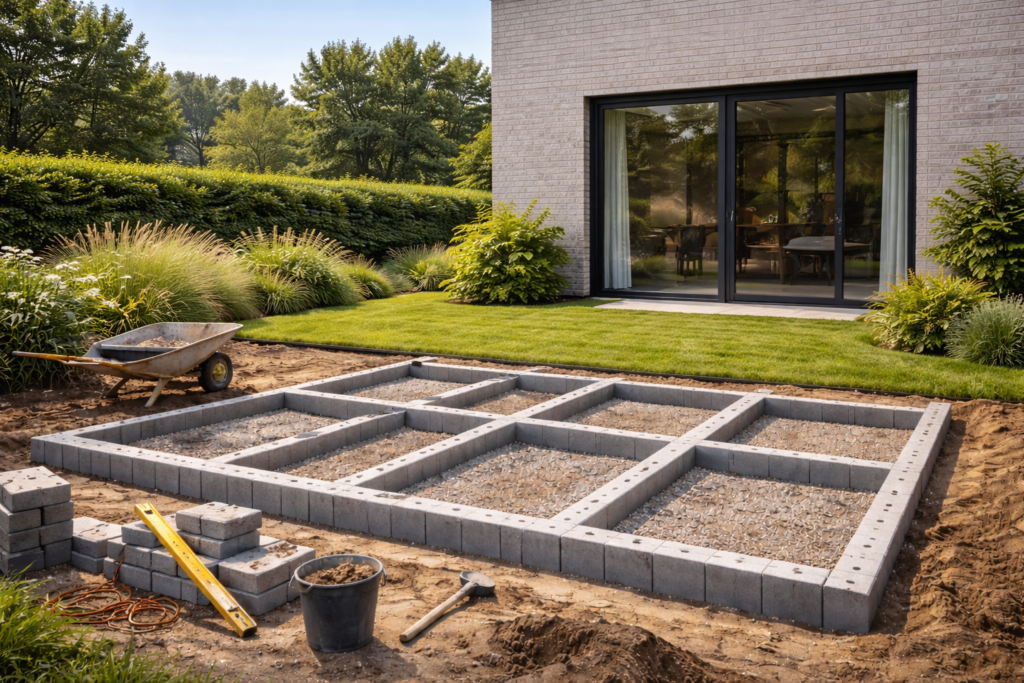 De aanleg van een fundering voor een lamellen overkapping begint met het bepalen van de juiste plek en maatvoering van de overkapping. Zo weet je zeker dat de constructie straks recht en stabiel staat.